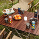 As the name would imply the Wide Action Table is wider than the standard Bamboo Tables, and instead of a bamboo top, the Wide Action Table utilizes aluminum slats wrapped in a faux wood vinyl print making these substantially lighter than the bamboo tops. The legs are aluminum anodized with a titanium finish and black plastic trip. All together it adds up to a modern elegant look. And to add to the value, the Wide Action Tables come with a carry bag included in the price.